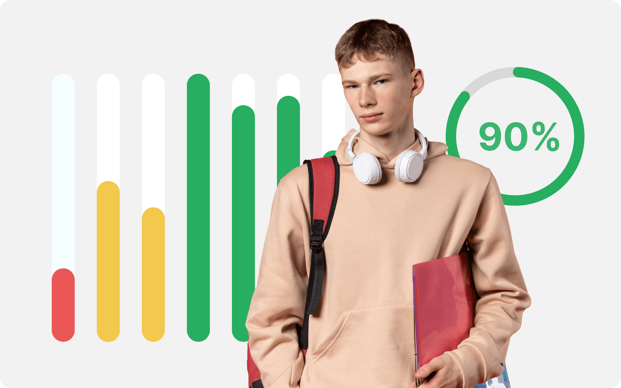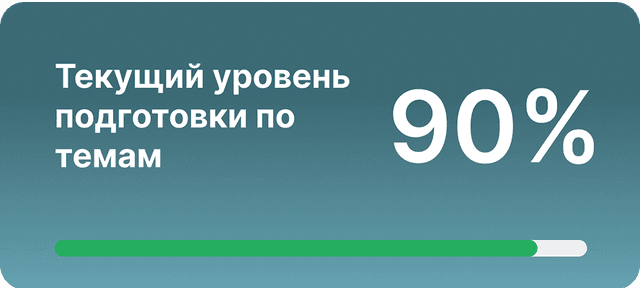 - Статистика показывает прогресс в изучении тем, время подготовки и твой текущий балл на тестировании