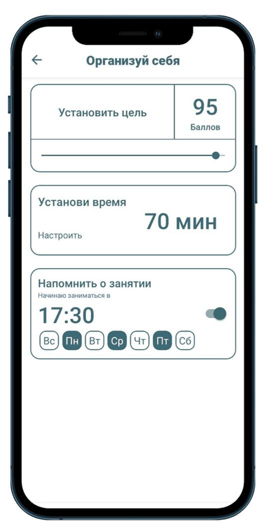 - Настройка подготовки поможет заниматься по графику. Установи необходимый балл, выбери дни занятий и их продолжительность и получай напоминания